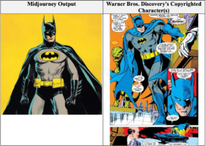 Warner supports its allegations in its complaint with numerous examples of AI-generated images and videos produced by Midjourney in response to user-generated prompts which feature Warner’s copyrighted characters such as Batman, Bugs Bunny, and Tom & Jerry (see example below).29[29]Warner Bros. Compl. ¶ ¶ 73, 2.